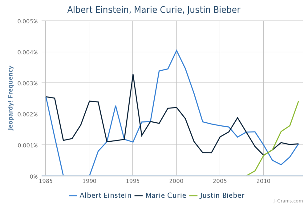 This graph shows how frequently the terms “Abraham Lincoln” and “iPod” have appeared in Jeopardy! clues from 1985 to today.